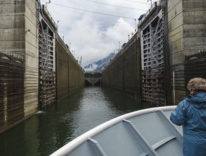 We entered the Bonneville Lock, the gates closed behind us, and fairly quickly the chamber filled, and we were lifted 70 vertical feet to the first of the many reservoirs that we would traverse. Not far upstream from the lock and dam, our ship tied up at the old Cascades Lock, which was built in the late 1800s to allow boats to pass around treacherous rapids that existed prior to the construction of Bonneville Dam.