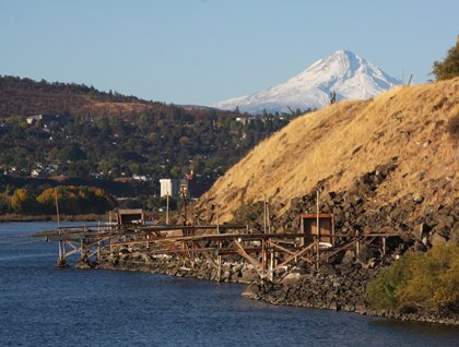 Our day began in the Dalles lock, which lowered us 65 feet. As the miter gates of the lock opened, we saw Indian fishing platforms. These plank structures, jutting out from the shore, have been used here for perhaps 10,000 years! Sadly, the most impressive fishing site, Celilo Falls, lay beneath the water just upstream, but here was a token of its former glory. Moments after we left the lock, Mount Hood came into view. It was a magnificent sight.