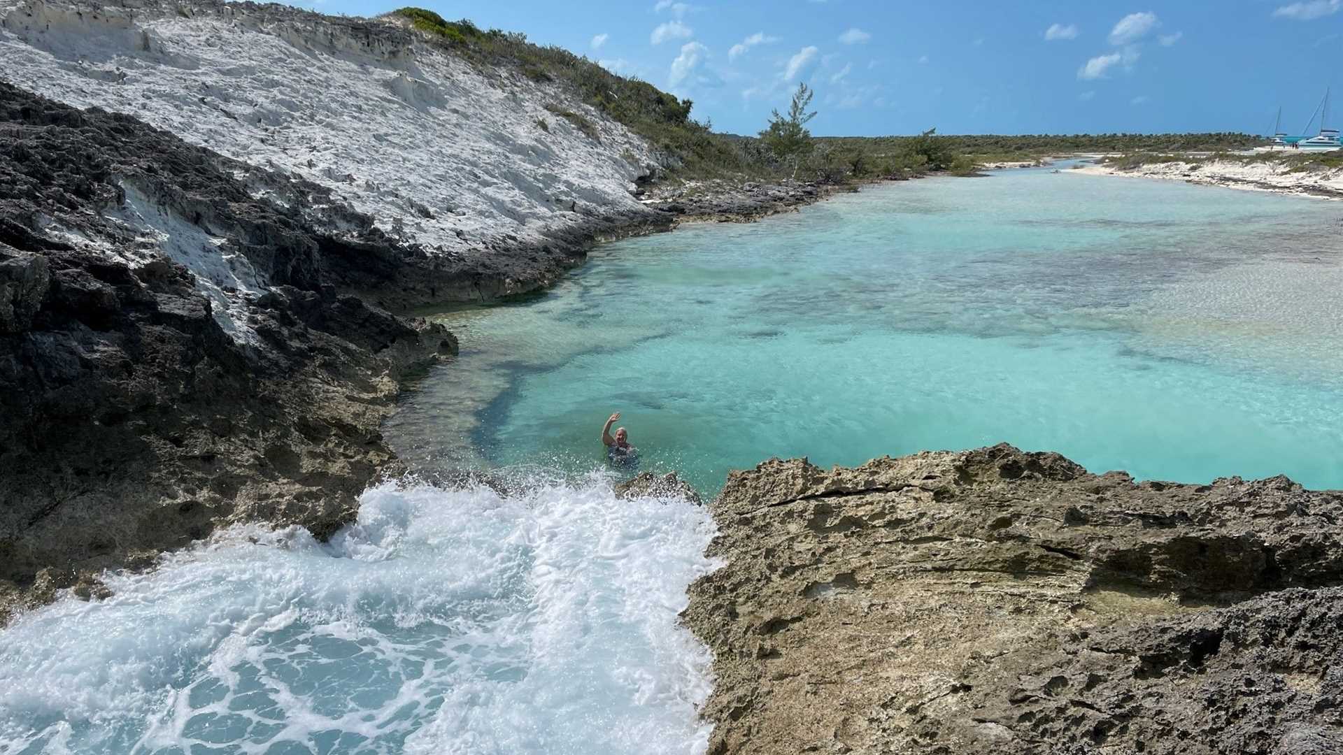 Strong winds and choppy seas did not dampen the spirit of adventure for National Geographic Sea Lion guests as they ventured off to explore Compass Cay. The morning activities included hikes, interpretive walks, a Zodiac cruise, and a short kayak paddle in Bonefish Creek, a tidal creek that runs between the outer ridges of Compass Cay. The trail along the windward rocky shoreline ends at Rachel’s Bubble Bath, an inviting tidal pool that fills when waves crash onshore and spill over the rocks into the pool. A refreshing reward for our hikers on the long hike.