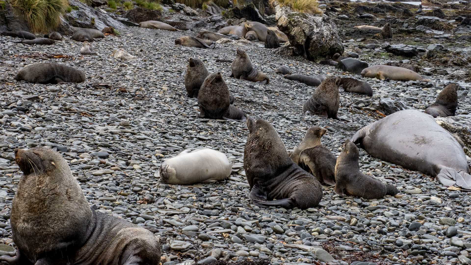 Speaking of tension, you can feel it rising as the Zodiac hits the shoreline and the first thing we see is a gauntlet of staff making a safe path for us between competing male fur seals. We discover South Georgia Island is going to make us earn our prize as we climb up a short but steep hill to the top of the ridge. There we make our way through the tussock grass, growing on tuffs of soil. Ever watchful for a resting fur seal, or a nesting penguin, we make our way to the main penguin colony.