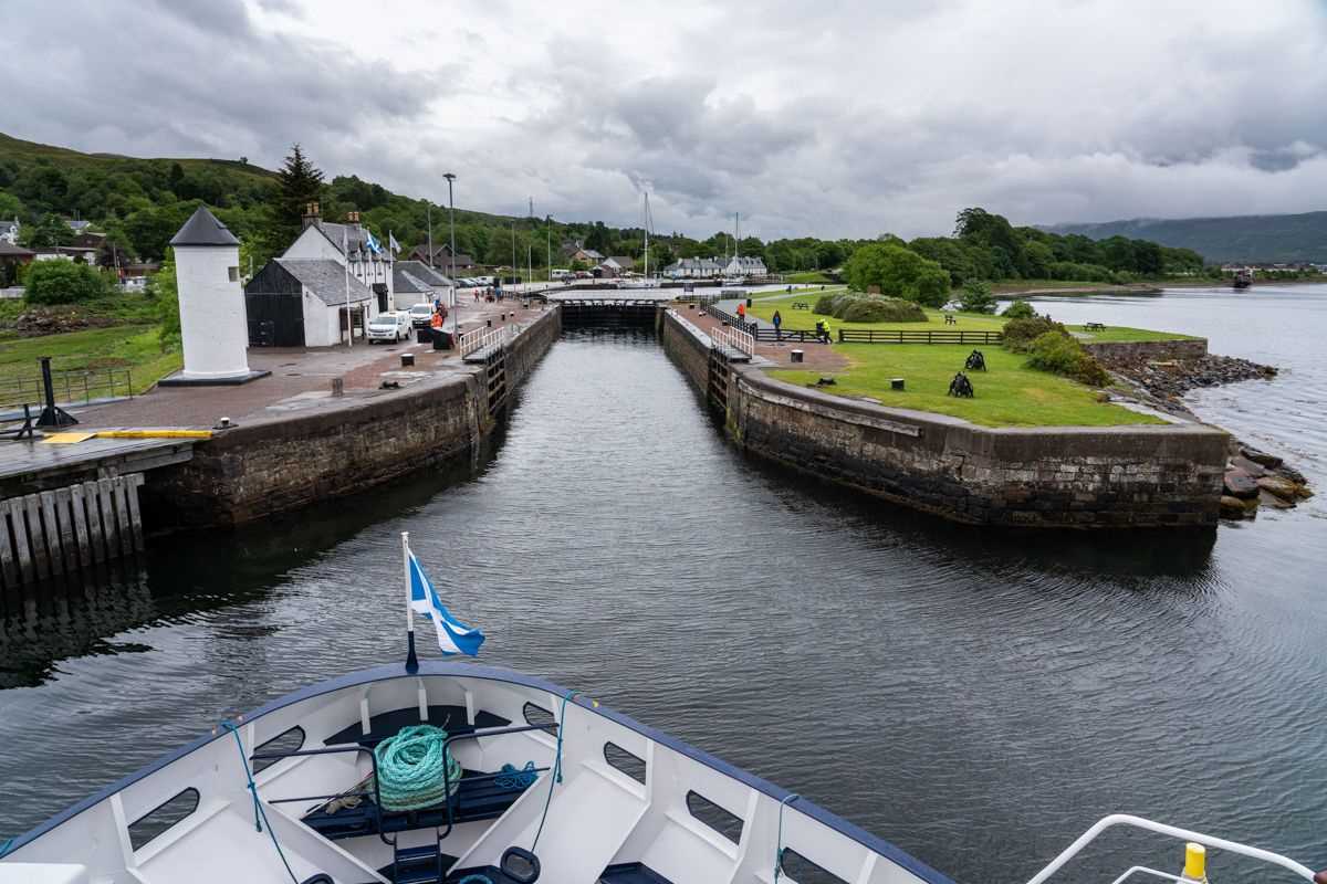 Tidal considerations necessitated an early departure from Oban this morning as we had to arrive at Corpach where the Atlantic sea lock of the Caledonian Canal is situated at the top of the tide. The Caledonian Canal was engineered in the opening decade of the 19th century by the great Scottish engineer Thomas Telford. It was a government-funded project at the time of the French Revolutionary Wars, designed to enable the more rapid exchange of naval vessels from the North Sea to the Atlantic. By the time the canal was completed, the wars had ended and the age of sail had been replaced by the age of steam. The larger steam-powered vessels were unable to navigate the canal and its commercial future looked unviable. Today, the bulk of the traffic on the canal is recreational and our ship, Lord of the Glens, is the largest vessel plying its tranquil waters. The canal runs through the Great Glen, a route from the earliest times, and links a sequence of freshwater lochs, including Loch Ness—the largest body of fresh water in Britain.