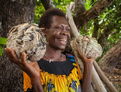 The Oceanic Discoverer eased into our morning anchorage beside Crown Island in the Bismark Sea. The morning sun lit the eastern sky, silhouetting the volcanic cone peak of Long Island in the distance. After breakfast we ventured ashore to visit the home of a large extended family that lives on this sparsely inhabited island. Elijah and his wife, their grown sons, in-laws, and numerous grandchildren are one of only three families living on Crown Island. We were warmly welcomed ashore by them and their many dogs. Their thatched-roofed houses were built on stilts just inland from the beach, near a shallow open well that provides them with fresh water.