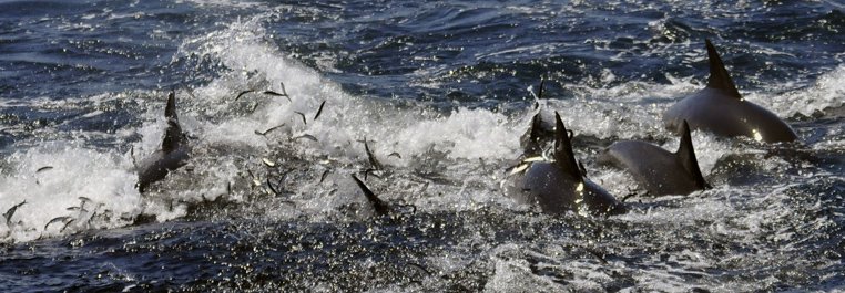 Throughout the morning we attended several briefings and picked out snorkel gear. Once the fog lifted, we scanned the calm sea for signs of marine life as we continued on towards our afternoon landing site. We were not disappointed! A dark line ruffled the surface in the distance beneath a number of wheeling seabirds. Upon closer inspection, we discovered that long-beaked common dolphins were creating the disturbance. Soon hundreds of animals surrounded us. Some caught the bow wave, while others acrobatically launched themselves high in the air. At one point, a tight school of frantic baitfish came right below us with fast-paced dolphins in hot pursuit, as you can see in the photo. What an exciting start for our first day at sea!