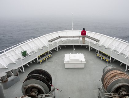 Today brought another day at sea, cruising a ways off the polar ice edge. The reason we’re not spending time right near the ice is that fog has enveloped the area, and visibility is extremely poor. So for safety reasons it is prudent to give the ice some room! Hopefully, visibility will increase at some point today, and we might have a chance to look for wildlife along our path near Greenland.