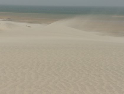 The desert that starts in Egypt arrives here at the Atlantic Ocean. Dakhla is a peninsula so we are going out to the north and then curve 90 degrees east, leaving the asphalted road for a sand one. The day is getting hot. No wind. We run with the 4x4s on the sand. That’s not a desert of dunes but of rocks and sand. Bumping is part of the adventure. And our backs feel that.