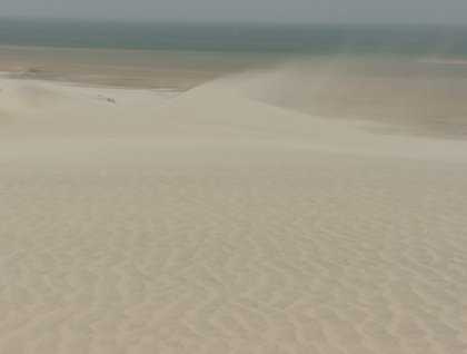 At the camp, the group is trying to eat the lunch served by the local crew. Sand is everywhere...we chew sand and couscous together. My dish is pink – the color of the sand. We decide that is better to go back soon. Just in case it gets worse.