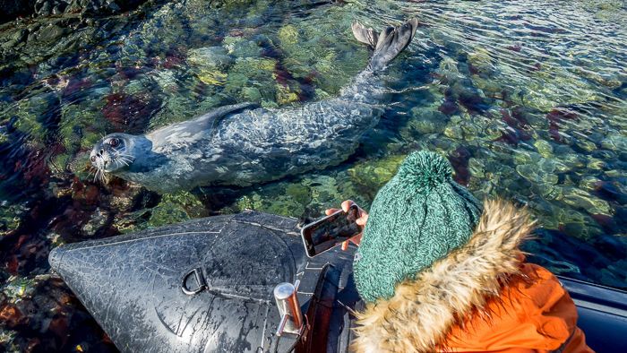 We are surrounded by rocky islands that are permanently covered by ice cliffs. Some surprises wait for us around each corner of the islands. A few chinstrap penguins here, there some Antarctic fur seals, a leopard seal on an ice floe, some shags and gulls nesting, some Weddell seals hauling out. We arrive back aboard late for our recap, one ultimately interrupted because of humpback whale breaching and orcas spotted from the bridge!
