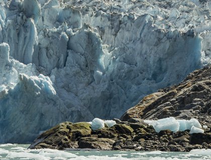 We traveled further into the winding fjord, passing ice of varying size and shape, tempting us with photographic distractions, yet we pressed on. With the walls gradually closing in, our quarry came into view. The cerulean hues of Dawes Glacier were matched only by the clarity of a clear morning sky. Icebergs were strewn about the fjord’s flat water in swirls of chalky white, pressed on their wayward journey by light winds and pulsing tides. Peppering the ice lie the silvery harbor seals, some with small pups eagerly suckling on their mother’s fat-rich milk. It all seems so serene, if not for the thunderous crashes of fractured ice periodically birthed from the glacier’s ever-changing face. A small splash belies a future cacophony as water in two fundamentally different forms meet with such force that the shockwave reaches deep into the psyche of us all, creating memories and a common bond over one of nature’s great spectacles.