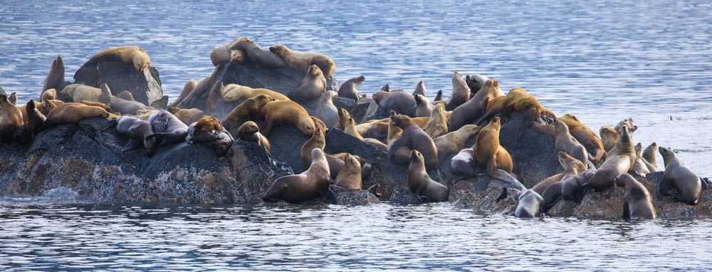 Today we woke to the familiar growlings of thousand-pound sea lions. After breakfast, we moved to the real leviathans, finding feeding humpback whales on our way into the picturesque Endicott Arm.