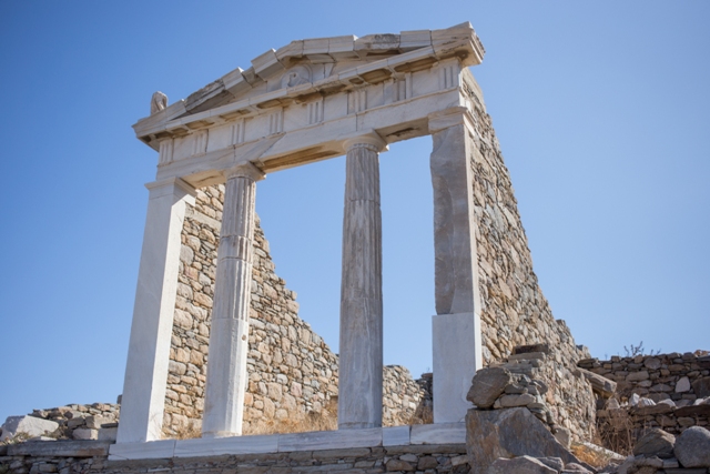 Our wonderful guides, Stella and Ellie, led us on our exploration of this uninhabited and historically crucial island. The island of Delos has seen habitation for at least 4,000 years, long before the Greek speakers arrived. The Ionians came here around the year 1,000 B.C.E. and brought the legend of Apollo with them when they established the annual Delia festival. Myth has it that Leto, pregnant from her affair with Zeus, was seeking a sanctuary from his jealous consort Hera to give birth to her son and daughter, Apollo and Artemis. Zeus had the unfortunate habit of consuming his children so that he would never have any rivals. Leto gave birth to the twins at the edge of the sacred lake. Artemis, who became the chaste goddess of the hunt, was born first, followed by her twin Apollo, the god of the sun and rationality. Delos soon became a place of pilgrimage for the island Greeks and this in turn led to its becoming a bustling commercial center with a population of some 30,000 by the 1st century B.C.E. Athens made Delos the center of the first Delian League, the first Athenian naval confederation in 478, making Athens the leading city-state amongst the Greeks.