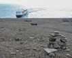 This is where the famous Franklin Expedition spent its first winter (1845-6) and also where three of the sailors died and were buried. The bay is now named for his ships: the Erebus and the Terror. Beechey Island has both a majesty and a bleakness to it. The curved beach rises back toward a cliff face, and the sparse plant life barely shows up amongst the small rocks that cover the landscape.