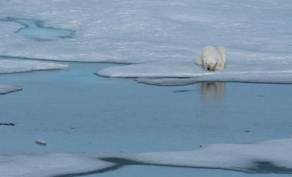 The bear was lying on its side on the ice with his head curled under one foreleg. Its paws stuck out to one side, stacked over each other, which managed to make the ice look cozy. We approached very slowly, and the bear stayed put. He looked over at us a few times before laying out on his front with his eyes looking straight toward us.