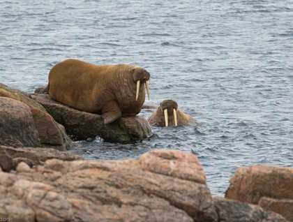 Zodiac cruisers explored the shores of Philpots Island and were rewarded with the sight of walrus both in and out of the water. On land hikers found a treasure trove of arctic plants and evidence of muskox in the form of scat and fur. Hiking up and over from the landing we got a great visual on the walrus and learned about the adjacent North Water Polynya that has helped to sustain both animals and people for eons bygone. The largest polynya in the Arctic, this is an opening in the ice created by winds and tides that creates somewhat of an arctic oasis for seals, walrus, bowheads, narwhal, and belugas to feed in the winter. Named “North Water” by 19th century whalers who relied on it for spring passage, it was a popular area not only for the whalers seeking the bounty of the bowhead but the native Dorset, Thule, and Inuit who have lived in this part of the Eastern Arctic. Dr. E.P Philpots and the crew of the whaling ship Queen spent the winter of 1865 in Queen’s Harbor seeking such cetaceans and the promise of blubber and baleen.