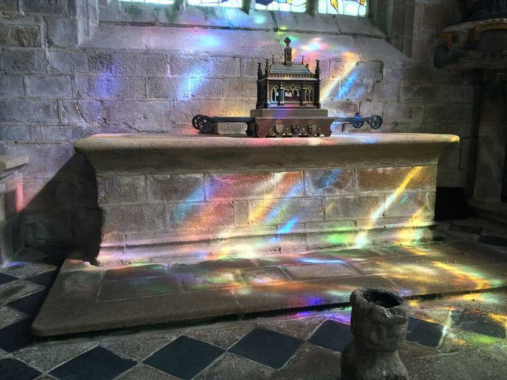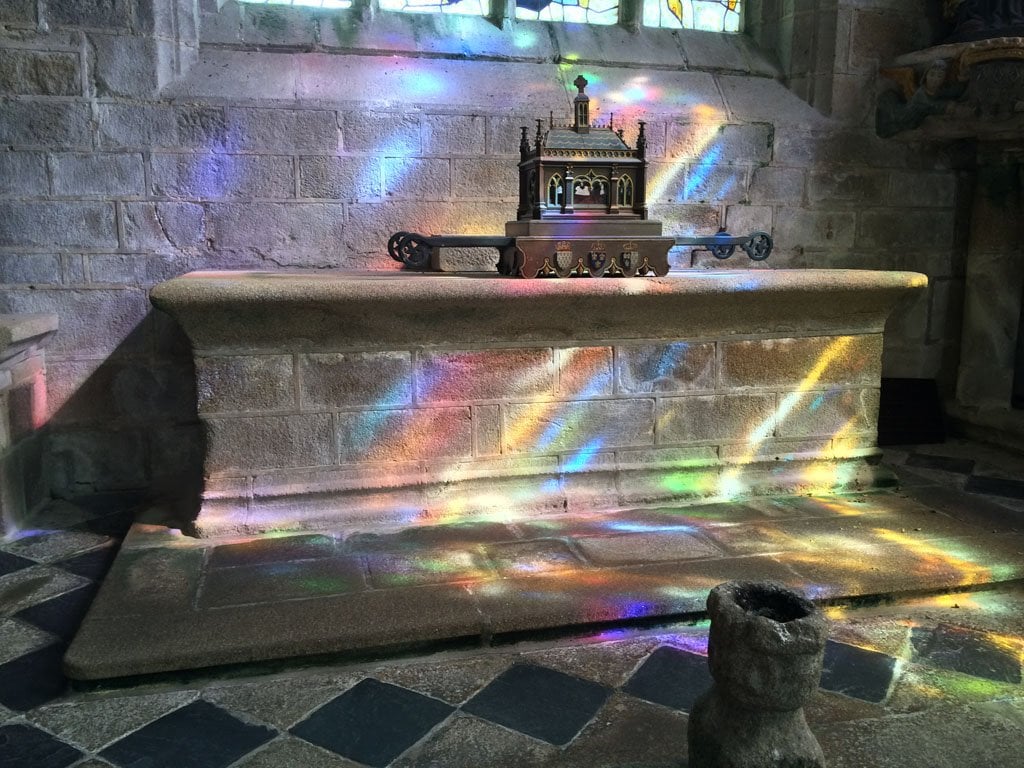 The bus ride to Locronon meandered through the beautiful countryside of western Brittany – sandy beaches, scattered villages, and granite farmhouses. Locronon is an exquisitely preserved town full of delightful stone houses and everywhere hydrangeas blooming in gardens and on window sills. The name ‘Locronon’ means ‘hermitage of Saint Ronan’ in the Breton language, an Irish hermit who came here in the 6th century, and whose relics in the medieval parish church are venerated to this day. This has given rise to La Troménie, a 12 kilometre long religious procession for which Locronon is famous. Our guided walk through the narrow lanes of the ancient town took us to the simple and lovely stone Chapel of Notre Dame de Bonne Nouvelle, one of the twelve stations of this procession.