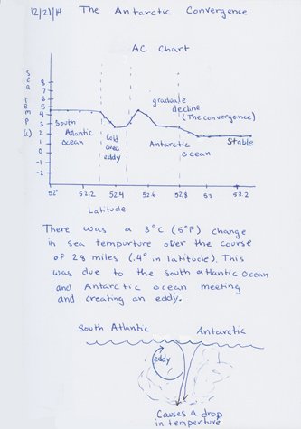 Throughout the day, naturalists Joe Holliday and Gabriela Roldan met with the Young Explorers, guests under 18. They had a ship tour and started daily journals. There was also a special session on oceanography, where our young guests learned about ocean currents and waves. They graphed the amazing Antarctic Convergence, which marked the beginning of the cold Antarctic waters.
