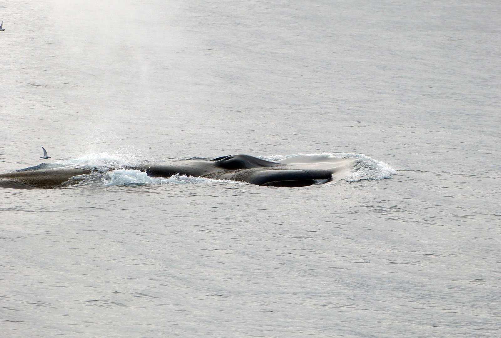 And so, reluctantly, we departed from South Georgia, reflecting upon our experiences around this incredible island. The sea was calm, the ride as smooth as we could ever wish. We were planning to spend our afternoon resting, working on our photos, and listening to interesting presentations. However, Chief Mate Yuriy Tupikov ruined all that when he spotted the spout of a whale. It was a big whale, with a very tall spout and an almost comically small fin set far back on its long body.  Yes, we were in the presence of a blue whale, the largest animal on the plane now and ever, its mass dwarfing even the largest of the dinosaurs. We grabbed warm clothing and rushed to our favorite viewing spots as the ship maneuvered to give us excellent views and photo opportunities. Once blue whales were abundant in the Southern Ocean, but they seem to be the slowest of the great whales to recover from the depredation of the 20th-century whalers. We can only hope that, with continuing protection, their populations will again approach their previous numbers, so that others might experience what we were privileged to see today. As we waited for the whale to return to the surface to breath, our attention was drawn to the abundance and diversity of seabirds soaring over the productive ocean, including wandering albatross. In that same moment: the largest of all the whales and the bird with the longest wingspan of all. Wow!