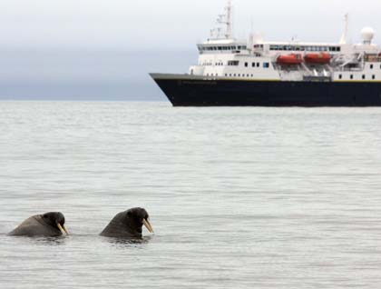 This morning Arctic enthusiasts landed by Zodiac downwind from a group of walruses hauled out at Kapp Lee on Edgeøya island. Just behind the walruses stood three huts, including a unique century-old octagonal one, evidence of humans braving the elements in this same place. We walked past a veritable boneyard of walrus parts, evidence of previous harvesting, to a respectful distance from a pile of a half dozen male walruses, ashore to rest and rub, tusks skyward. These mythical creatures were driven to near extinction after centuries of slaughter for their ivory tusks and for use of their tough skin as machine belts in early industrial days. Protected in Svalbard for over sixty years now, the walruses seem to be reclaiming old territory, including the more recent return of females and calves. It was reassuring to see living walruses today in juxtaposition to the blanching evidence of hundreds of strewn bones. Nutrients leaching out from the bones feed productive moss beds and flowering arctic plants. Life and death go hand in hand somehow. As we quietly observed the beached beasts, more walruses swam in the shallows, curiously investigating the humans ashore.