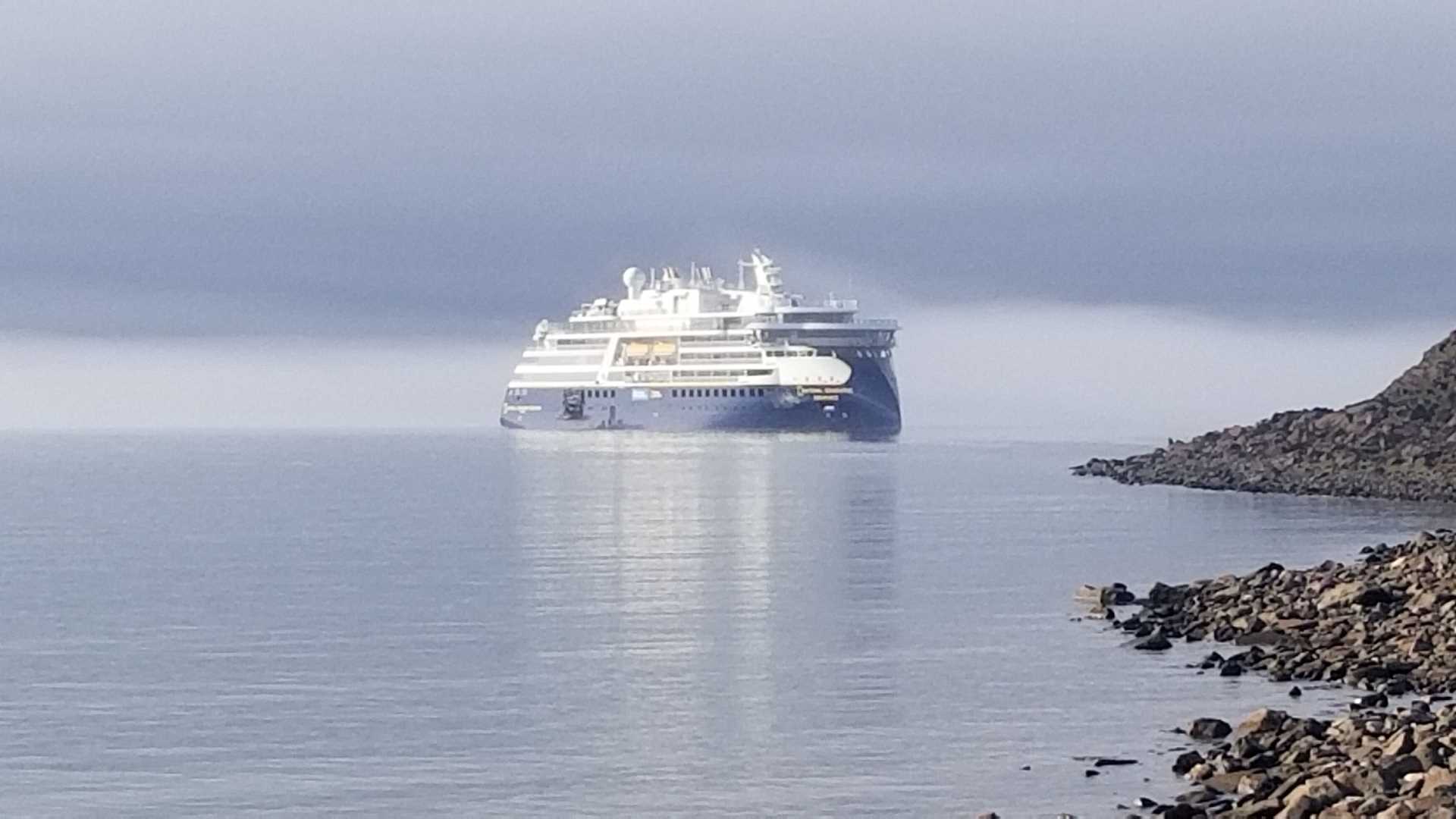 We spent the day doing activities from National Geographic Endurance on the north shore of Coronation Gulf, Nunavut. The day began with fog rolling off the sea and onto land, but it did not interfere with any of our planned activities. In the morning, we had the opportunity to kayak, hike, or both. Kayakers paddled around the calm bay. They watched jellyfish in the water, looked at the granite cliffs, and spotted an arctic hare. Hikers went inland on Edinburgh Island across a lush tundra vegetation full of flowers, grasses, and short willows. They stopped to see several caribou antlers, bear and wolf scat, and the tracks of several animals. The guests even stopped to pick blueberries and learn about the tundra ecosystem from the naturalists. When they got to the tall Precambrian granite cliffs, they saw and heard peregrine falcons flying around. Each hiking group took the time to watch the adult falcon pair and their offspring fly, hunt, and sit on the cliff.