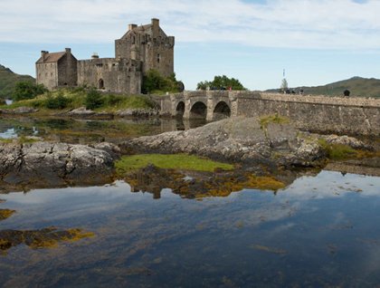 Moving on to Eilean Donan we encountered greater numbers of summer visitors at what is said to be the most photographed castle in Scotland. Its familiarity derives from movies like The Scarlet Pimpernel, filmed on location here. In its current form it dates from the opening decades of the 20th century and is thus representative of a Scottish Revival style that evolved alongside the Arts and Crafts movement. Originally the site of a Celtic anchorite’s cell, the castle name means Donan’s Isle, from the name of the sixth-century saint. It was rebuilt by a descendant of the McCrae clan whose castle ruin it was and inaugurated in the 1920s. The situation is incomparable with a natural tidal moat and mock mediaeval causeway; a photographer’s heaven. Weather conditions were perfect; a still day of early autumnal sunshine, the first such day for a long while and, by cruel fate, the day school resumed in Scotland after a long, wet summer break.