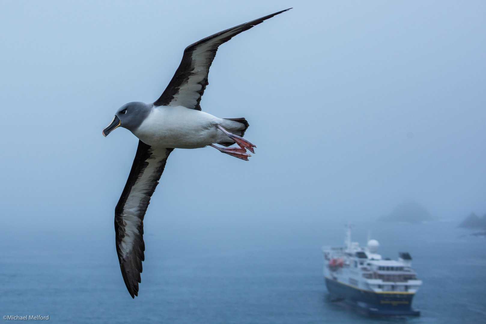 The rest of us opted for Zodiac cruises around the scenic bay. We were also richly rewarded with many opportunities to be in awe of the extraordinary wildlife that inhabits this amazing part of the planet. Gray-headed, black-browed, and light-mantled sooty albatross flew above us and nested on the steep, tussock-covered mountain sides and rocky outcrops. These gorgeous birds always delight with their grace and beauty. Occasionally their soulful calls could be heard and enjoyed, as the sounds seemed to hang on and on trapped in the steeply rising slopes. Lastly, along the way we came to a large, bare patch of open ground with a few black and white dots here and there. These were macaroni penguins gathering in their breeding area for a new breeding season. It was hard to visualize that in a few weeks time that area would be covered with hundreds of nesting birds.