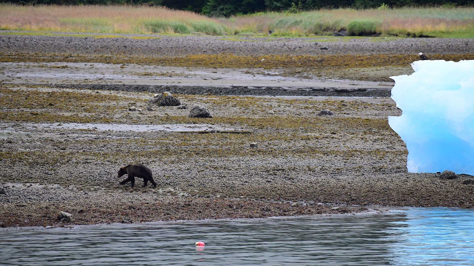 along the shoreline. One brown bear searched at the foot of an iceberg left