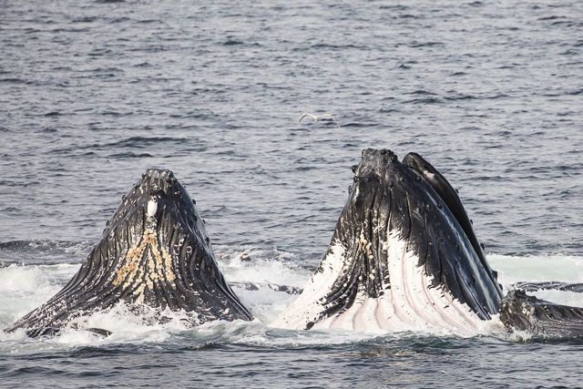 After a steamy frothy espresso and some toe-touching with our wellness specialist, our blood was flowing properly, and we were ready for another day in the Great Land. Diners were joined for breakfast today by a humpback whale cow and calf engaged in restful “logging” activity, setting the stage for a serene morning sail. They turned out to be the first of many majestic M. Novaeangliae we would encounter, most being much more active. We soon found ourselves approaching Morris Reef, and surrounded by not one, but two groups of humpbacks engaged in cooperative bubble-net feeding behavior! We spent time with both pods, viewing and photographing many spectacular lunges, with up to nine of these leviathans’ gaping maws breaking the surface simultaneously and in tightly choreographed formation. Our Global Explorers were then given an opportunity to receive Zodiac driving lessons from our USCG-licensed captains. All souls returned. We continued into the storied seven-mile-long Sitkoh Bay. Here we hiked an old logging road; amongst towering Sitka spruce, frequent bear signs, black-tail deer, and banana slugs galore! Once the wind abated, we also had the opportunity to launch our kayaks and enjoy a leisurely paddle in the bay, with views of National Geographic Venture , bald eagles, and an early 1900s cannery sight. At the end of the day, the ship embraced our return with cocktails, charcuterie, and conversation. A typically highly succulent dinner was followed by a night-capping presentation on birds of the region from our resident ornithologist.