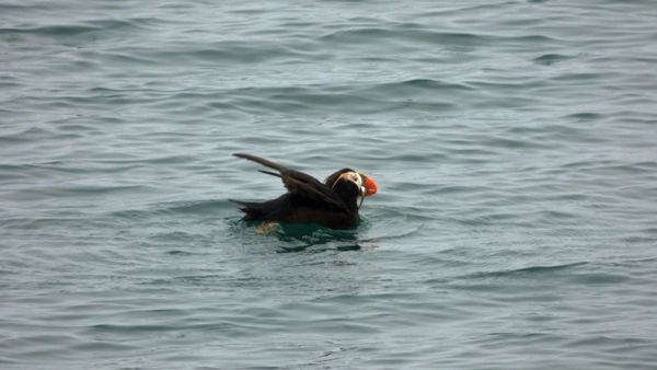Calm, turquoise waters shimmered with reflections of snow clad mountains as National Geographic Quest made its way up Endicott Arm. Our destination: Dawes Glacier in Tracy Arm-Fords Terror Wilderness area! Blue skies and a gentle breeze accompanied the journey towards the glacier. We anchored, lowered Zodiacs and continued to get as close to the wall of ice as was safe. We cheered many calving events, with one in particular, taking the show by far! Who knows…20 tons? 30 tons? 100 tons? of ice freefell from the 200+ foot wall of ice into the water. We continued to cheer the huge splash which was followed almost 2 seconds later by the thunderous roar created by the calving event. Incredible!
