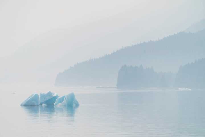 We awoke at the terminal moraine bar in Holkham Bay at the entrance to Endicott Arm. A light haze hung in the air, creating varying blue layers of hills and mountains around the bay. Humpback whales surfaced and blew in several directions. Clouds above created soft light that brought out the blue in the “bergy bits” (smaller pieces of icebergs) that floated by. We entered a section of the bay where hundreds of surf scoters floated alongside Canada geese, and marbled murrlets bobbed in the calm reflective waters. Bald eagles sat atop ice floes, riding them out in the current and flying off to fish now and then. The bay was a hub of activity this morning! After breakfast, we continued our journey up Endicott Arm towards Dawes Glacier, inside Tracy Arm-Fords Terror Wilderness within the Tongass National Forest. Bits of incredible blue ice floated past us languidly in reflective waters. We stopped within view of the glacier and launched Zodiacs to explore the ice, waterfalls, and amazing geology of this fjord. All of us learned about the geology and natural history of the fjord, and several guests witnessed calving ice off the face of the glacier while others explored beautiful pieces of textured ice.