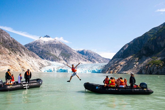 Dawes Glacier, the destination for our morning, is a tidewater glacier in direct contact with the ocean. As the tides of Southeast Alaska rise and fall, sometimes experiencing more than 20 vertical feet of change, the fluctuating water level stimulates the floating edge to calve off large chunks of ice, often in dramatic fashion. With our expedition landing craft, we ventured among the multitudes of icebergs, harbor seals, and bergy bits seeking the best views of the glacier face. The brilliant aquamarine hues, intricate natural ice sculptures, and the nearly incomprehensible scale of the fjord and glacier together were magnificent! A determined and daring few capped off this wonderful day with a cold-water plunge, swimming alongside icebergs back dropped by the glacier itself, in true Alaskan fashion.