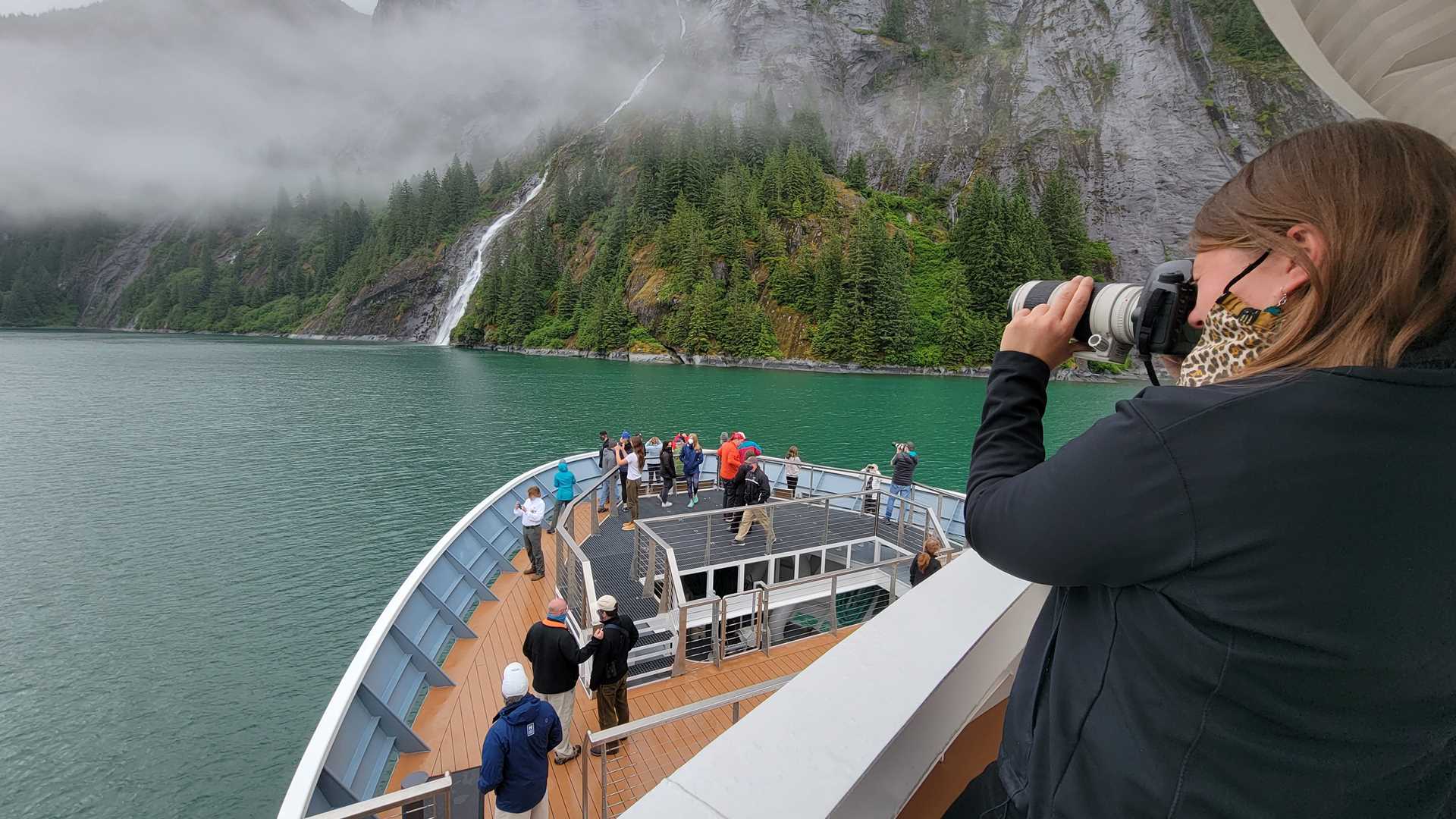 As we woke up on our first morning in Southeast Alaska, we found ourselves shrouded in fog, with dark mountains fading up into the clouds. It was quiet as the occasional piece of ice floated by, and the ethereal mood of the morning mists compelled us all to come out and visit the bow. Waterfalls wandered down the mountains, and the number of ice pieces floating by increased.