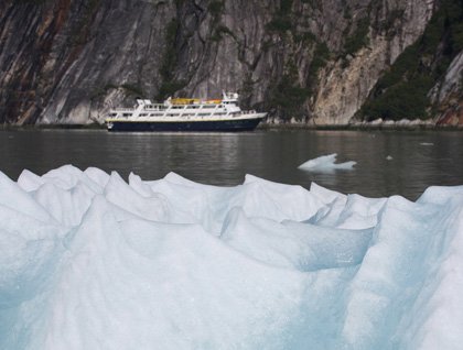 And we had a marvelous day on which to enjoy it. Early in the morning we crept through thick fog, but by breakfast this had burned off to reveal deep blue sky. Snowy peaks looked blindingly white in the sunshine. Brightly lit cliffs towered all around us.  Deep shadows accentuated striations that scored their sides. Icebergs gleamed. Some were vast, looking like buildings or landscapes, others were diminutive, like lacey swans. And at last we saw their source – the Dawes Glacier. This river of ice runs down from the peaks along the Canadian border, carrying a bit of winter down to the moderate Northwest Coast.