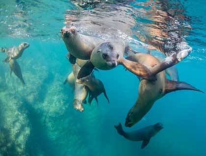 Soon we were able to meet the ‘lions on their own terms. Wearing snorkel gear, we slipped into the water. Though ungainly on land, sea lions are marvelously adept in the sea. We saw them whip by at high speed, hang upside-down in complete comfort, or writhe in elegant contortions. Only problem is… they’re bored. Luckily, people like us come by regularly to entertain the ‘lions. It’s obvious they enjoy playing with us, making mock-charges, tugging on our snorkel gear, and showing us how desperately clumsy we are beneath the waves. Like a barrel full of monkeys mixed in brine with frisky puppies, sea lions are a ton of fun.