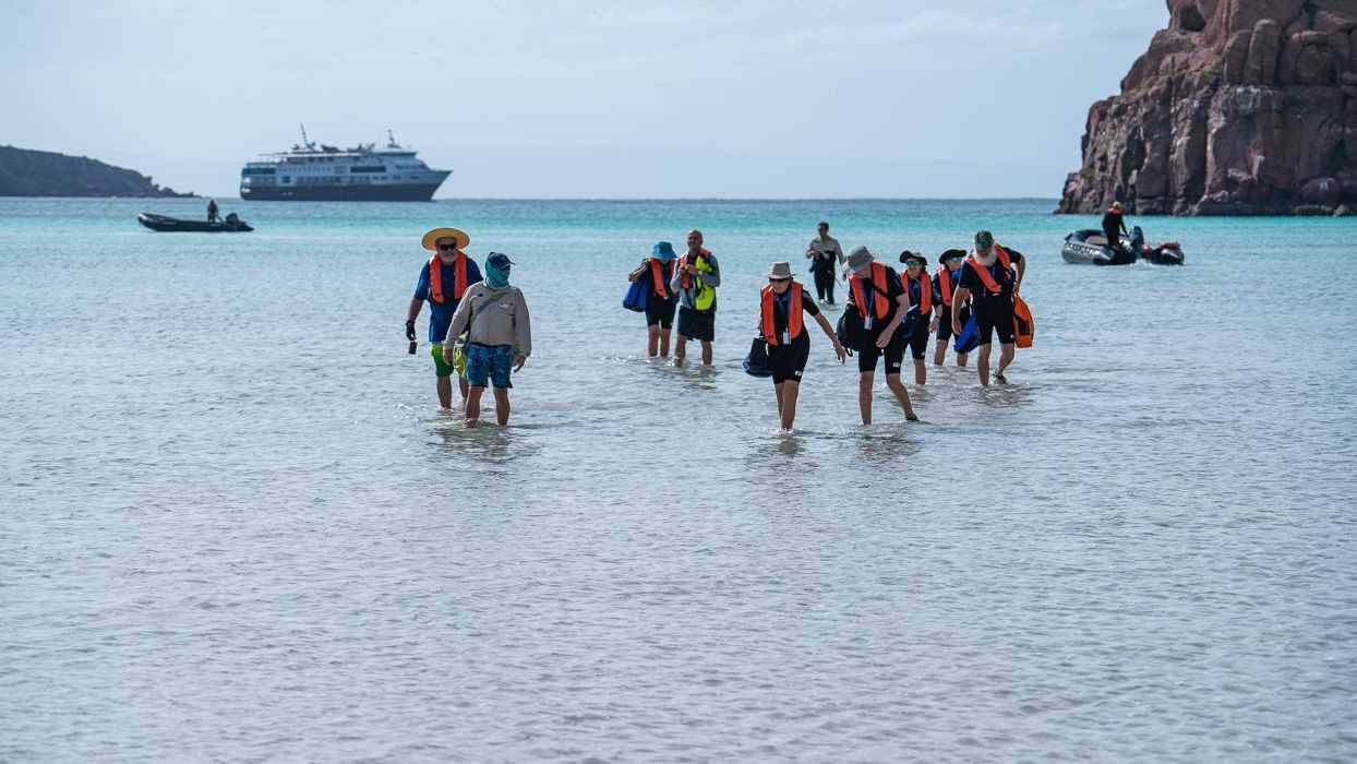 On our first day, we left the dock at La Paz and spent the morning sailing through the Sea of Cortez. We arrived at Ensenada Grande in Espiritu Santo National Park, and spent the day doing a number of activities. Our guest ventured into the rocky arroyo on nature and photo walks to discover this vivid desert landscape and the flora and fauna that call it home. Other guests took to the water to snorkel and discover the beauty that lays beneath the crystal blue seas, while others kayaked and stand-up paddleboarded above. We ended the day with a chill yoga session with our Exhale yoga teacher, Jaclyn Allen. What an incredible way to start our trip here in Baja. We headed back aboard National Geographic Venture at sunset for cocktail hour and dinner. Now, with a sense of what Baja has to offer, our guests are excited to see what tomorrow brings.