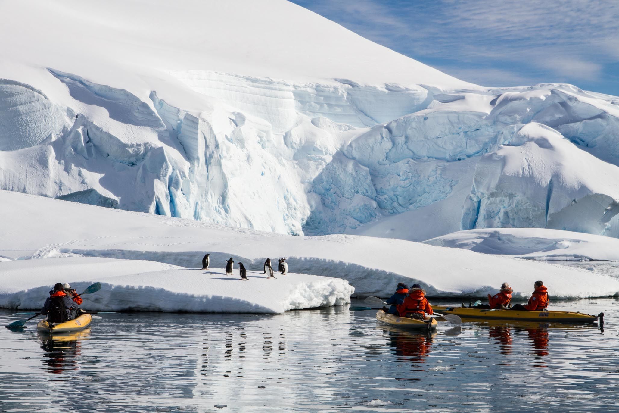 What a day! The National Geographic Explorer woke on another stunning morning in Antarctica as the ship navigated through the Gerlache Strait towards Enterprise Island. Conditions allowed for mirror reflections of the passing icebergs and mountains as well as good humpback whale sightings. The day’s busy activities started with kayaking and Zodiac cruising within the sheltered bay before the bravest of guests and staff took the polar plunge. Next up was a brief repositioning, once again through spectacular scenery into Wilhelmina Bay in search of fast ice. The ship was soon nosing into the ice allowing for an easy disembarkation. Our two ski guides led a long cross-country ski into the wilderness while the rest of us enjoyed the ice with a beer and BBQ. The best was yet to come, as a young emperor penguin made its way onto the ice and navigated around the entire group before plopping back in the water. The best thing was it actually waited for the skiers to return so all were rewarded with great views of this magnificent bird.