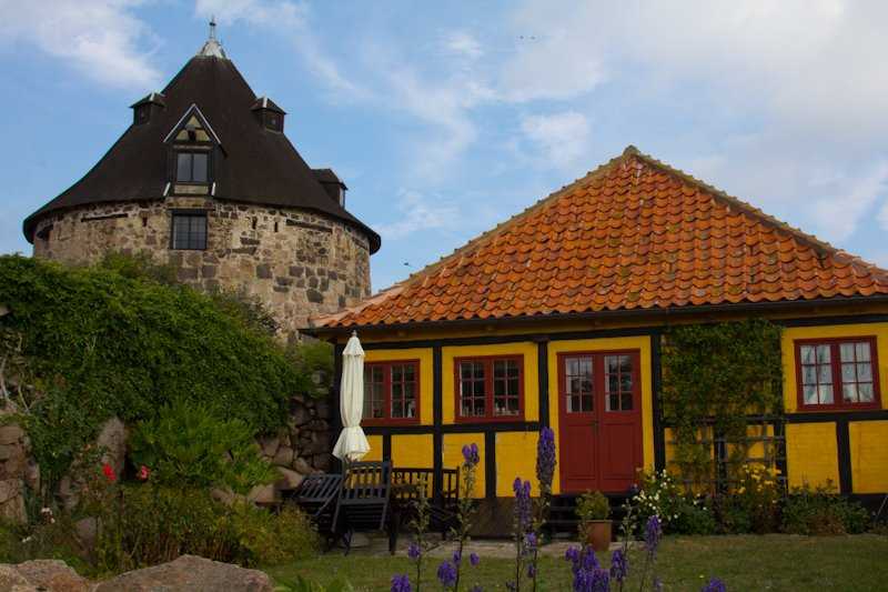 Christianso became an important place when fortifications were built beginning in the late 1600s.  These were finally tested during the Napoleonic War, when Britain tried to take what had become a significant base for privateers.  The fortifications cover the island, and many of us walked its ramparts as one would the walls of many an ancient town.  Houses now stud the island, typically mustard-colored, with red-tile roofs.  Most include charming little gardens, with flowers, apple trees, or vegetable plots all competing for space.  Jutting bedrock or fortifications added a bit of rough-and-tumble to the gentle environs.  Trails thread among the houses, leading through forest groves or stark stony seaside clearings.  Photographers had an easy task here, as nearly every turn revealed another fine vista or rustic scene.  Nature walkers saw more seabirds, combed the trees for songbirds, and found a few fat frogs.  All the while, the sun was warm and the breeze was cool, enhancing what was already a thoroughly pleasant experience!