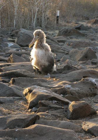 The afternoon hike along a boulder trail proved to be an outstanding wildlife experience. We spent two hours observing sea lion pups in shallow tidal pools, reddish marine iguanas warming up before evening on the black rocks, Nazca boobies courting, a pair of Galapagos hawks, and elegant adult albatrosses doing some of their dancing and taking off from the cliff to soar above us. This flat, arid island was amazingly full of animals and birds!
