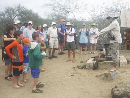 Eruptions millions of years ago took place on the northeastern side of the island, bringing different compositions of lava. Those eruptions that reached the ocean started to heat up the water and therefore killed many species of animals and plants. Several of the species affected by this phenomenon are shells and corals. Wave action took place as the saltiness of the ocean broke all of these organisms until a beach resulted from such a process. Sandy beaches are the most comfortable places for Galapagos sea lions to relax and rest after spending several days out in the middle of the ocean looking for food to bring back to their pups. The name of this place is Gardner Bay, and during the morning our guests practiced snorkeling activities in these waters, and enjoyed some time at the beach walking along the sea lion’s colony.