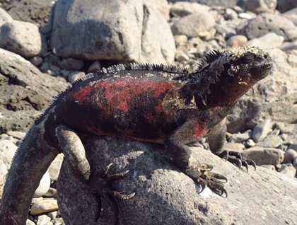 In the afternoon, we navigated west and dropped anchor off Punta Suárez, one of the highlights of the Galápagos. This small peninsula protrudes into the sea and is teaming with life. As soon as we set foot at Punta Suárez we were amazed by the number of creatures that inhabit this place, and we had to be really careful not to step on the very well camouflaged marine iguanas, which had just returned from their favorite foraging spot on the rocks. The iguanas need to regain their optimum body temperature in order to digest the algae that they eat, so they bask in the sun for the remainder of the day. The trail took us through the nesting areas of the local Nazca boobies, and we also walked past a female blue-footed booby that was looking after her young chick. Española is the only island preferred by the endemic waved albatross for nesting; many of them were courting and dancing in preparation for their next breeding season. As we returned back to our landing spot, we walked past a couple of white beaches where several female Galápagos sea lions rested while they nursed their newborn pups. This is a magical place where creatures are oblivious to our presence, and we soon realize that we have fallen under the spell of the Enchanted Isles.