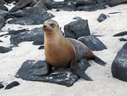 After snorkeling, the coralline sand beach welcomed us all and we had a great chance to interact with many sea lions resting on the beach. Newborn pups moved up and down the beach searching for their mothers as hunger pings in their stomachs. Females promptly and vocally deny any access to pups that are not their own, while large bull sea lions patrol their territories. Española mockingbirds flitted about the beach, digging in the sand for sustenance as they constantly bleeped out various intonations. As we lest the beach and headed back to our floating home, brown pelicans and frigatebirds glided overhead.