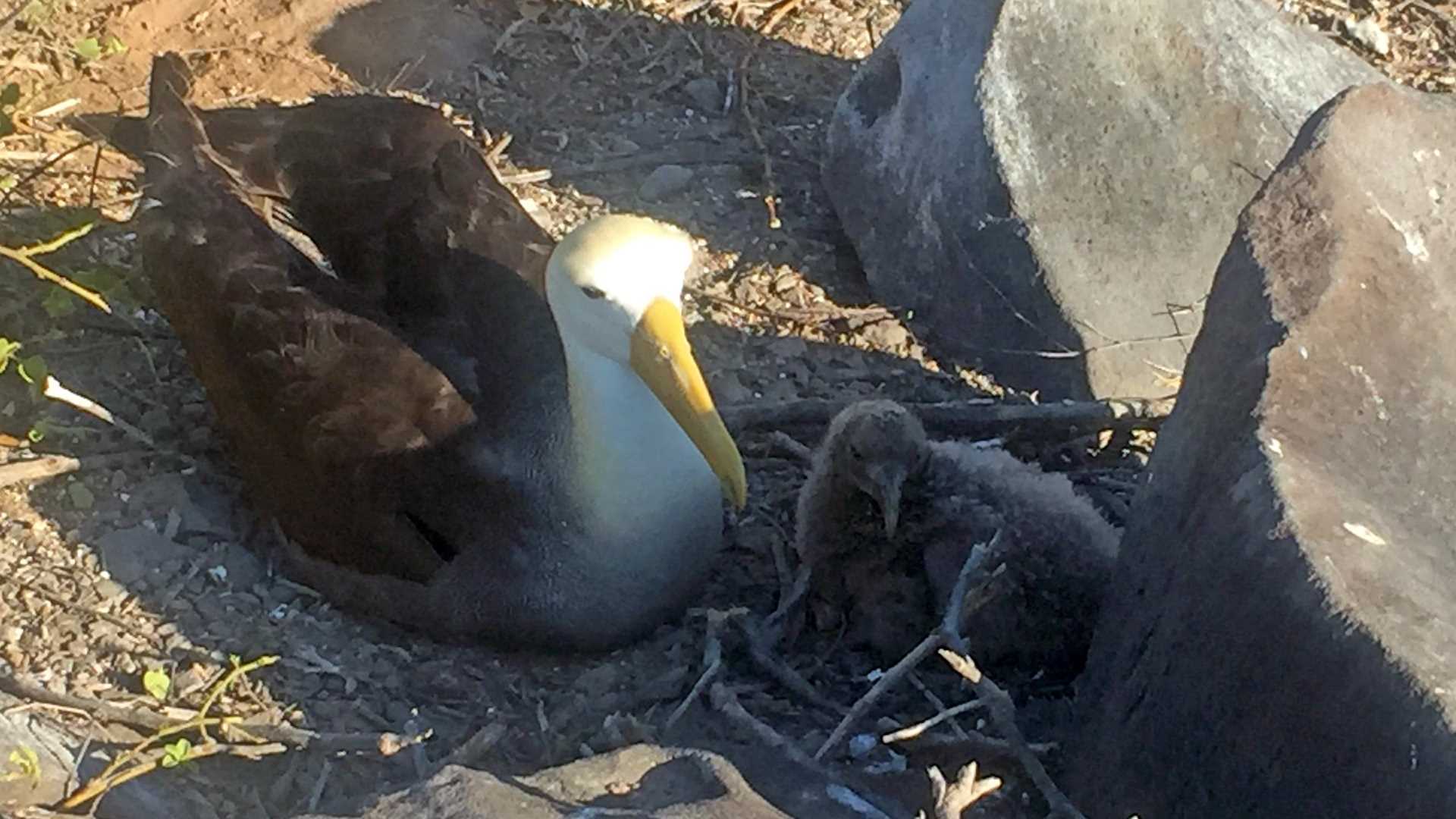 In the afternoon, after short navigation, the National Geographic Islander arrived to Punta Suarez. It was sunny but windy, making for a very refreshing walk along the trail. As soon we landed on the small pier we observed marine iguanas facing to the sun while they warmed their bodies. On the beach behind them sea lions slept indifferently. Walking inland we arrived at Nazca booby territory which was covered completely with guano. We observed some of them nesting and others walking around us producing their unmistakable sounds. We crossed the iguana’s nesting area and finally our efforts were rewarded when we arrived at the waved albatross territory. We saw juveniles with their fluffy brown feathers and many others in pairs incubating their eggs, or just resting. All the while the imposing Galapagos hawk hovered over us looking for a prey.