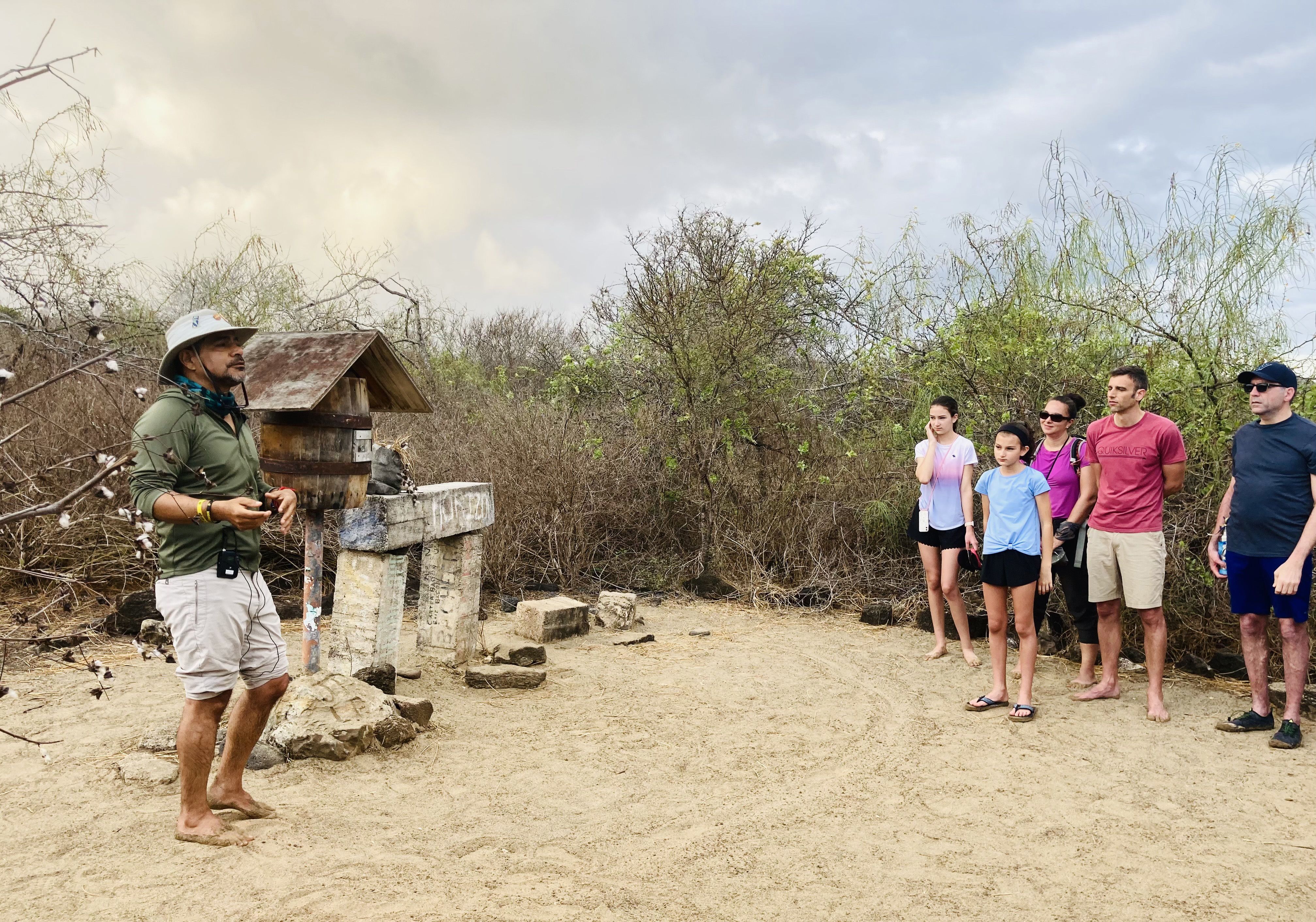 We woke up to super calm waters off the northern coastline of Floreana Island. Perfect conditions for a bit of kayaking among the offshore islets near Post Office Bay! Brown pelicans, egrets, green sea turtles, and red, black, and white mangroves…a peaceful environment for an hour or so before breakfast. Some guests went straight to the beach to walk a few yards through saltbushes and found themselves facing the famous “barrel” of Post Office Bay. It’s been over a century since the barrel was first placed here for use by whalers to exchange correspondence and carry back letters of business, or perhaps letters to loved ones. Today, postcards fill the barrel, but the turnover is fast. Each day, some of the postcards are taken for delivery while others are left behind in hopes that someone will continue the tradition and hand-deliver them in the weeks to come. Between breakfast and lunch, we played in or on the water around Champion Islet, just to the northeast of Floreana Island. We didn’t make a landing but explored by Zodiac, including a birdwatching circumnavigation followed by deep-water snorkeling in incredible waters with parrotfish, angelfish, pufferfish, damselfish…all kinds of fish! Sea lions buzzed by, desperate to draw attention and get a reaction out of us, which they did. Squeals and shrieks were heard. After an instructional briefing on iPhone photography and a presentation on Charles Darwin in the afternoon, we went ashore on the main island of Floreana. There has been quite a drought this year and not much rain the previous year either. The land was dry, the vegetation was brittle, and dead leaves were everywhere. But all that is fine for the native and endemic species; after all, they’ve been through this before, over the millennia, and survived. The stress is on the introduced species who depend on higher amounts of freshwater for survival. While their defenses are down and populations are stressed, now is the time to really push for programs to eradicate introduced species. Floreana Island is ready for restoration. The National Park and collaborating NGOs are preparing Floreana to receive native species that were once thought doomed for extinction. Giant tortoises, Floreana mockingbirds, and racer snakes may yet survive and prosper with the help of these organizations. We spent the afternoon following an easy trail from a dark-colored beach of mineral origin and over the isthmus to a white, organic beach where green sea turtles were riding the breakers offshore. The turtles are not quite ready to come ashore and lay eggs, as temperatures are still too low for another month or so. But a great blue heron and frigatebird were checking out the scene, just in case someone tried for an early nesting. It will be a couple months before hatchlings try to race to the ocean in the dark of night. We returned to our base of operations as the sun set low on the horizon. National Geographic Islander II was waiting for us with hot water and the comforts of home.
