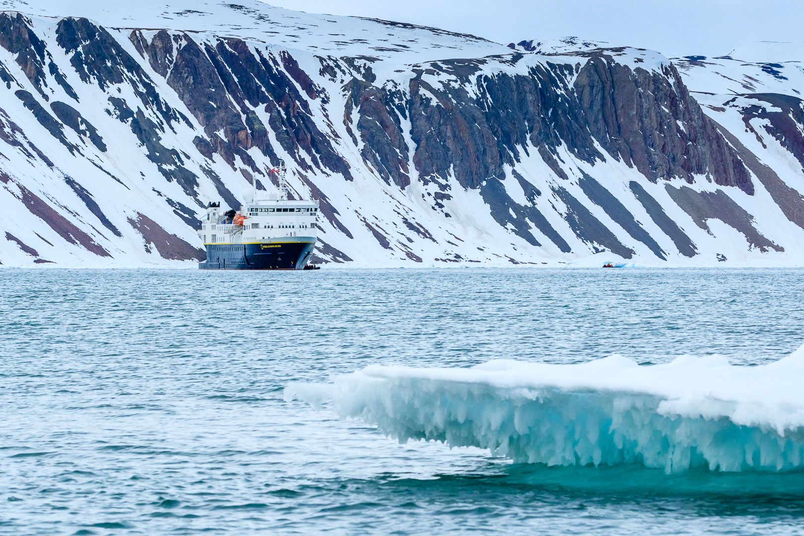 Today we awoke to find true arctic conditions–freezing temperature with wind and blowing snow. Although exciting, this made observing the bird cliffs at Cape Fanshaw before breakfast difficult. As our Plan B the National Geographic Explorer headed farther north seeking protection in Lomfjorden, along the northeast coast of Spitsbergen. Here we found suitable conditions for our morning explorations. Intrepid explorers went ashore for hikes of varying lengths on the tundra, while others explored at water level by Zodiac. During the afternoon the ship sailed across Hinlopen Strait to Murchisonfjorden along Nordaustlandet, crossing 80 degrees north of planet Earth’s equator. After navigating through the pack ice into a protected bay, we launched the fleet of kayaks and also explored by Zodiac. As with any true expedition, there were many surprises during the day, from walrus approaching the Zodiacs in the morning, to viewing distant polar bears on the ice from kayaks and Zodiacs in the afternoon. And we even made it back to view the spectacular bird cliffs at Cape Fanshaw after dinner. It was another thrilling day in the high Arctic!