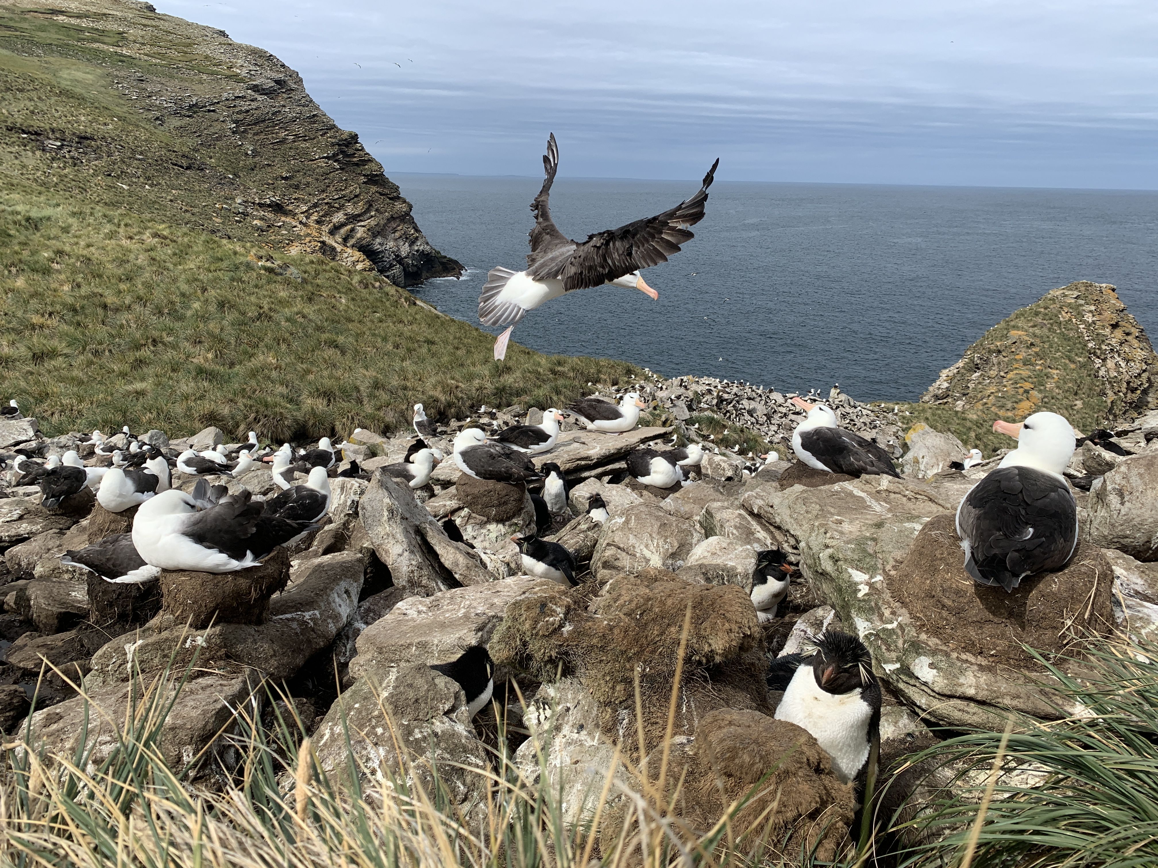 It is difficult to believe we’re on our last expedition landing day. Overnight we were peacefully anchored in Ship Cove and woke up to another fine morning. Even after such an active, eventful voyage, there was still an atmosphere of enthusiasm to seize this final day ashore. Disembarking near the New Island Settlement, we went on a walk through short grass to the tussock atop mixed cliffside colonies of black-browed albatross, rockhopper penguins, and imperial shags. After returning for a quick lunch on board, some of us opted for a long hike along the northern spine of the island to a small sandy beach on the northwest side. The rest of us rode the National Geographic Endurance around the island to meet our comrades on the beach or on the hillsides above the cove.