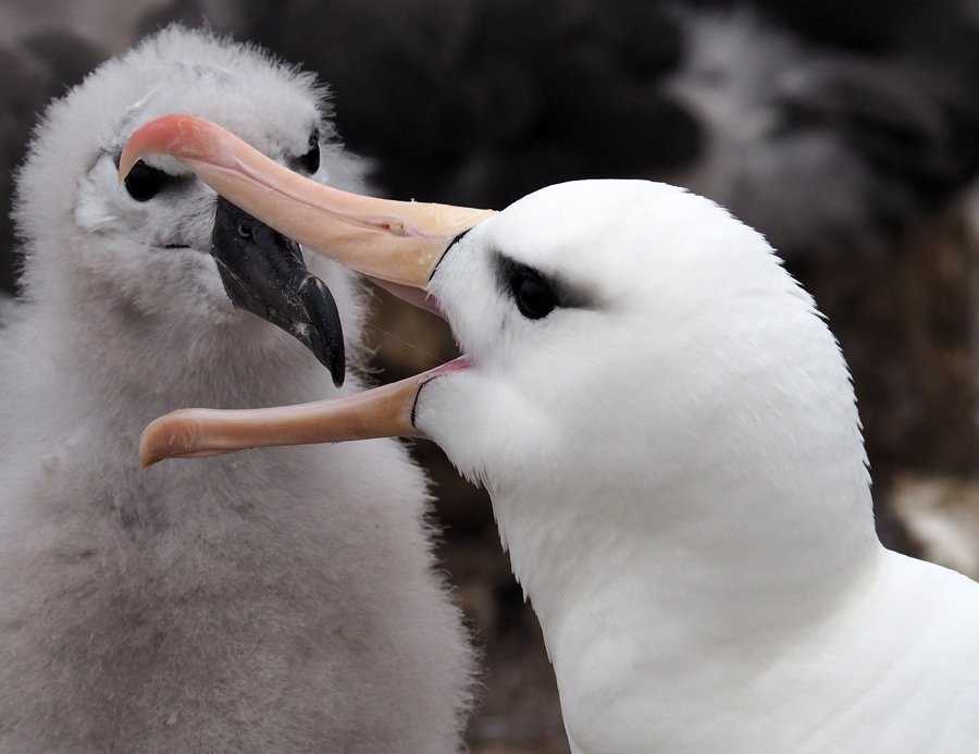 Soon we all were on shore and hiking towards one of the largest black-browed albatross colonies in the world. Already at the beach we were greeted by striated caracaras, black tussock birds, and of course hundreds of molting gentoo penguins. After a 15 minute hike around the corner to one of the higher peaks here, a ‘sea’ of albatross chicks ahead. After finally also making it through almost two meters high tussock grass we were able to sit on the edge of this huge colony with black-browed albatrosses, mainly well feed and well-grown chicks. Soon we saw adults fly in making a not so graceful landing, making their way to its the specific nest and chick. The feeding is made by having the chick peck at the adult’s beak and force it to regurgitate the food (mainly squid) that has been collected during almost a week roaming the ocean. Further down the slope a large colony of hungry rockhopper penguin chicks were also waiting for adults to arrive with fresh food.