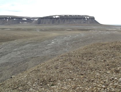 We spent the morning in Maxwell Bay, in the southwestern region of Devon Island, and landed at a beautiful and austere place called Fellfoot Point. Our landing was on the edge of a huge delta created by the outwash of a braided network river formed by meltwater from some unseen snowcap in the center of the island. The broad river valley is obviously an old U-shaped glacial valley ground out of the surrounding raised sandstone. The resulting geology is spectacular and provided us with great opportunities for hiking. Some of us went far into the main valley and up onto the slope of a side tributary where we were rewarded with wonderful views of the entire area. See Figure A.