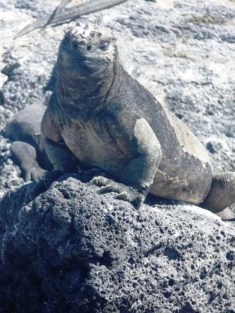 After navigating all throughout the night, we reached the western isles of the Galápagos. These are considered the most remote and pristine islands, as well as the youngest areas of the archipelago. As dawn broke, we could see the elegant outline of the shield volcanoes of both Isabela and Fernandina Islands. The National Geographic Endeavour dropped anchor at Punta Espinosa, on the northeastern tip of Fernandina. This was to be our morning excursion; a first impression of the coastline, could make one think that the place is totally devoid of life. Black, jagged lava rocks are present everywhere, and there is definitely a lack of water and vegetation. Fernandina is simply too young, having been totally resurfaced in the last five thousand years. Therefore, its biodiversity is rather low, albeit extremely interesting. Upon landing, we started encountering the most abundant inhabitant of Fernandina: the marine iguanas. These endemic and unique creatures have undergone fantastic adaptations in order to survive in such a harsh environment, and they have become extremely efficient at obtaining the seaweed that is the main part of their diet. Further inland we found several tidal pools and a rocky shoreline covered in ulva, or sea lettuce, which make this area a rich foraging grounds for sea turtles, of which we observed dozens if not hundreds. Another inhabitant of the shoreline of Fernandina is the flightless cormorant, and we were lucky enough to find an active nesting couple, already rearing two healthy-looking chicks. Punta Espinosa is rich in beautiful volcanic features, like the pahoehoe or ropy-surfaced lavas, and from the trail we could admire La Cumbre, the summit of Fernandina, a shield volcano with the shape of an overturned soup bowl.