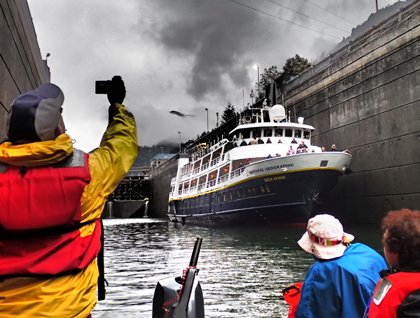 At lunch time we were recovering our energies when we heard the exciting word: whales! From our dining room we were able to spot some fins coming out of the water. We ran to the outside decks to discover a group of killer whales! Our officers did a wonderful job turning the ship back so we could enjoy this whale watching.