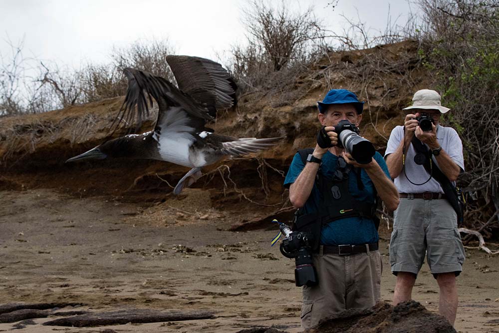 In the early morning before breakfast, we visited Punta Cormorant for a short walk. As we landed, we spotted several types of birds, including whimbrels, blue-footed boobies, frigate birds and many others. At Punta Cormorant there is a large brackish lagoon among saltbushes, mangroves and carpet weeds. This lagoon is the habitat for different types of birds, some of which are migrant, while others are resident or endemic to the islands—the highlight here is the greater flamingo.
