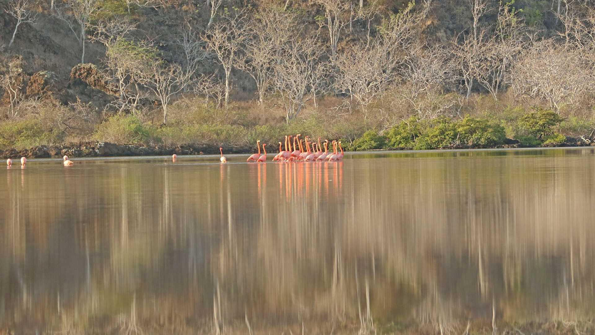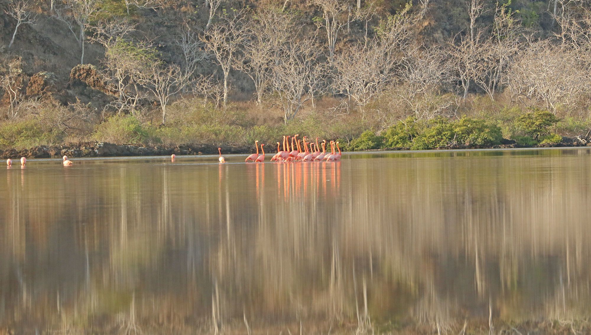 Behind the beach, a brackish lagoon is home for some waders, like American greater flamingos. We saw them performing a parade as part of their courtship display. We observed Galapagos ducks. Nesting blue-footed boobies and nesting turtles also occupy this island spot.