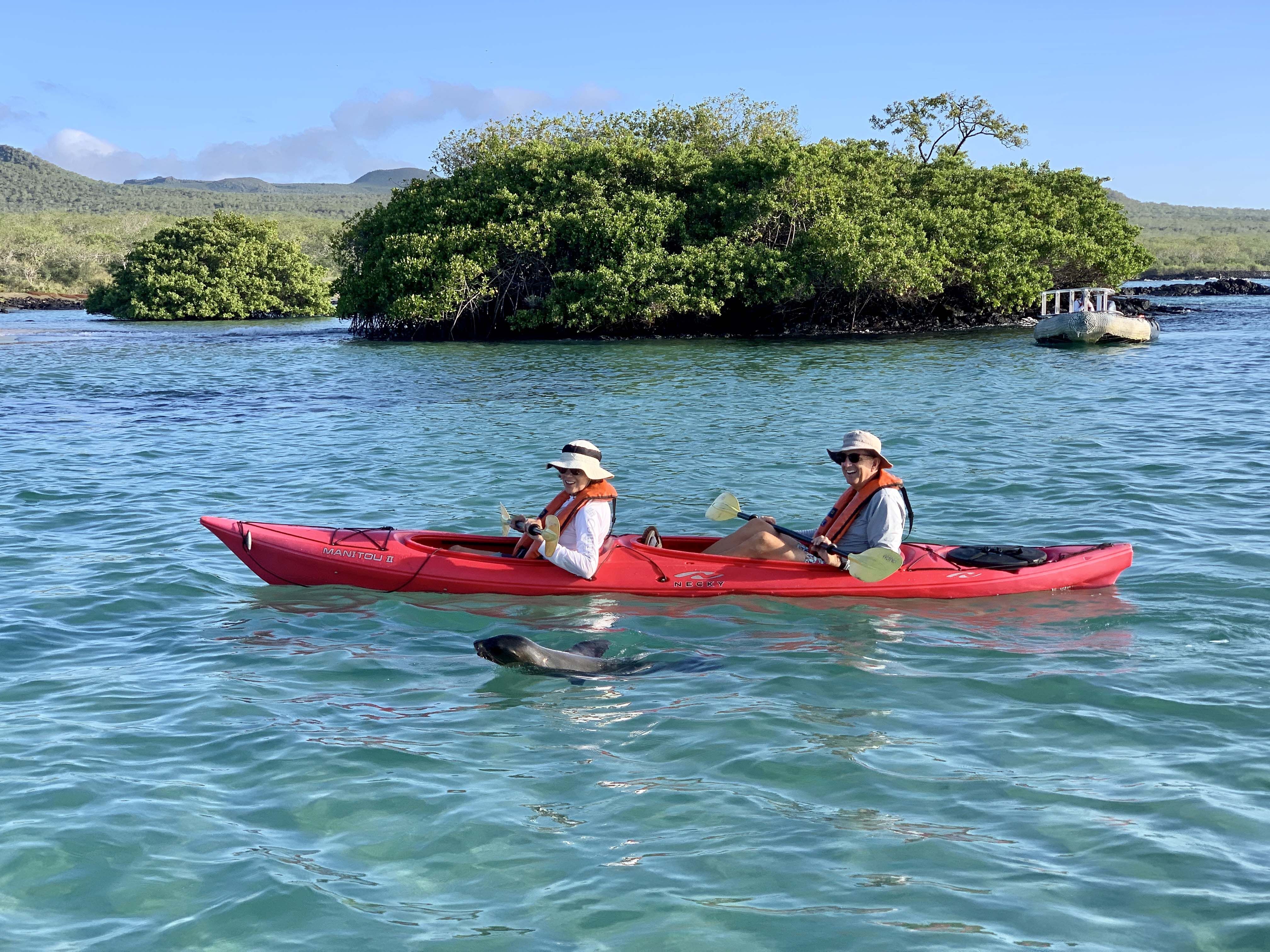 Today, National Geographic Endeavour II visited Cerro Dragon, located on the north part of Santa Cruz Island. We found one of the largest colonies of land iguanas. During our hike, we spotted the iguanas all around the trail. Some basked on the vegetation, and others were active. We saw the zigzag head movement they use to protect their territory and impress females. An Ecuadorian buffet lunch was set up in the dining room. We started with the traditional ceviche and ended with tres leches for dessert! We enjoyed snorkeling and Zodiac rides. We observed wildlife all over the place, including spotted eagle rays, sharks, blue-footed boobies, great blue herons, marine iguanas, and hundreds of other animals. They all reminded us why the Galapagos is so special.